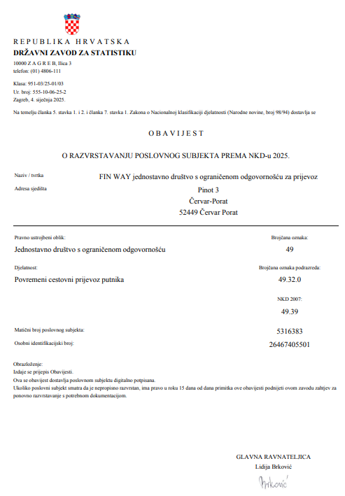 Pri upisu u Registar poslovnih subjekata Državni zavod za statistiku poslovnim subjektima i dijelovima poslovnih subjekata izdaje Obavijest o razvrstavanju poslovnih subjekata prema NKD-u 2025.