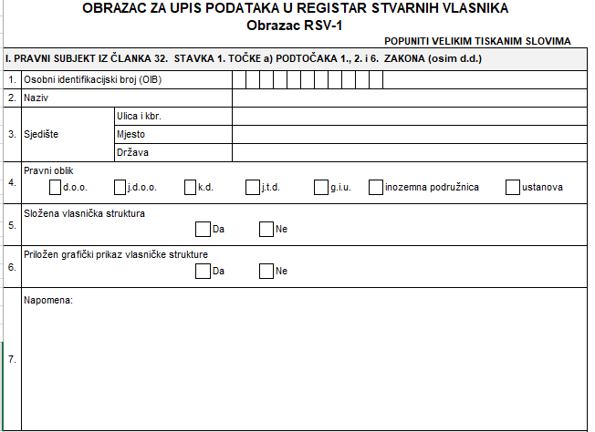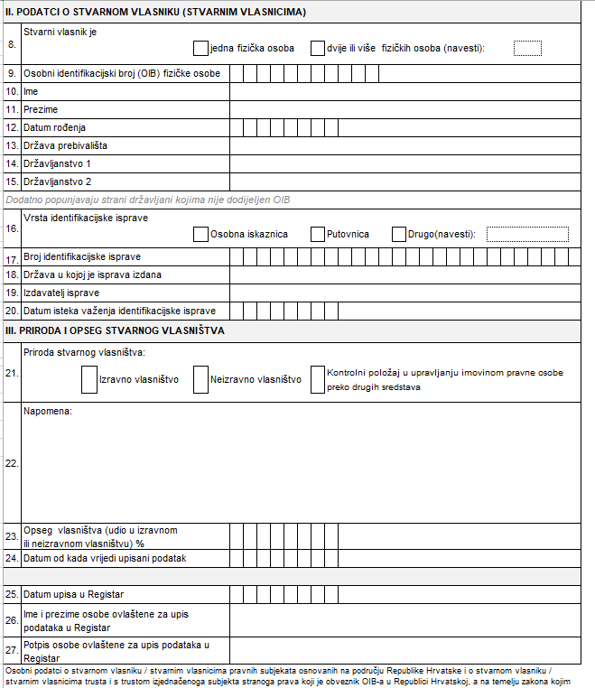 Prijava je namijenjena utvrđivanju činjenica koje su od utjecaja na obračunavanje, utvrđivanje ili naplatu poreza i drugih javnih davanja za potrebe vođenja postupka pred poreznim tijelima. Podaci moraju biti ispunjeni čitljivo, tiskanim slovima i bez naknadnog prepravljanja.