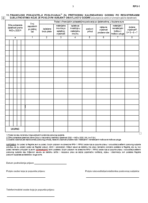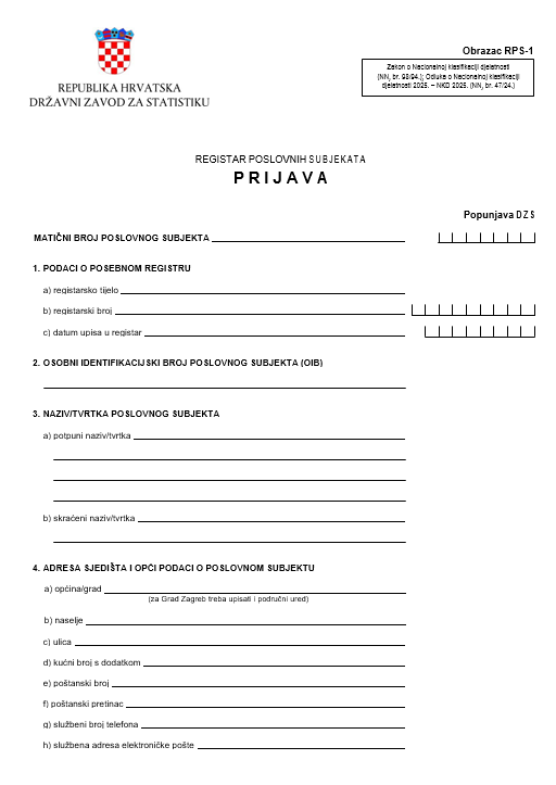 1. ispunjen obrazac RPS-2, što ga je potpisala osoba koja je ispunila prijavu i rukovoditelj/ovlaštenik poslovnog subjekta. Obrazac možete preuzeti ovdje (PDF) ili ovdje (.DOC). Za lakši odabir glavne djelatnosti u točki 2. GLAVNA DJELATNOST (obrazac RPS-2) možete upotrebljavati NKD Pretraživač.